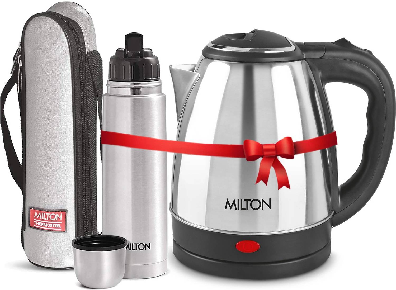 MILTON Go Electric Stainless Steel Kettle, 2 Litres and Flip Lid Bottle, 750 ml 2750 ml Steel Flask (Pack of 2, Silver)