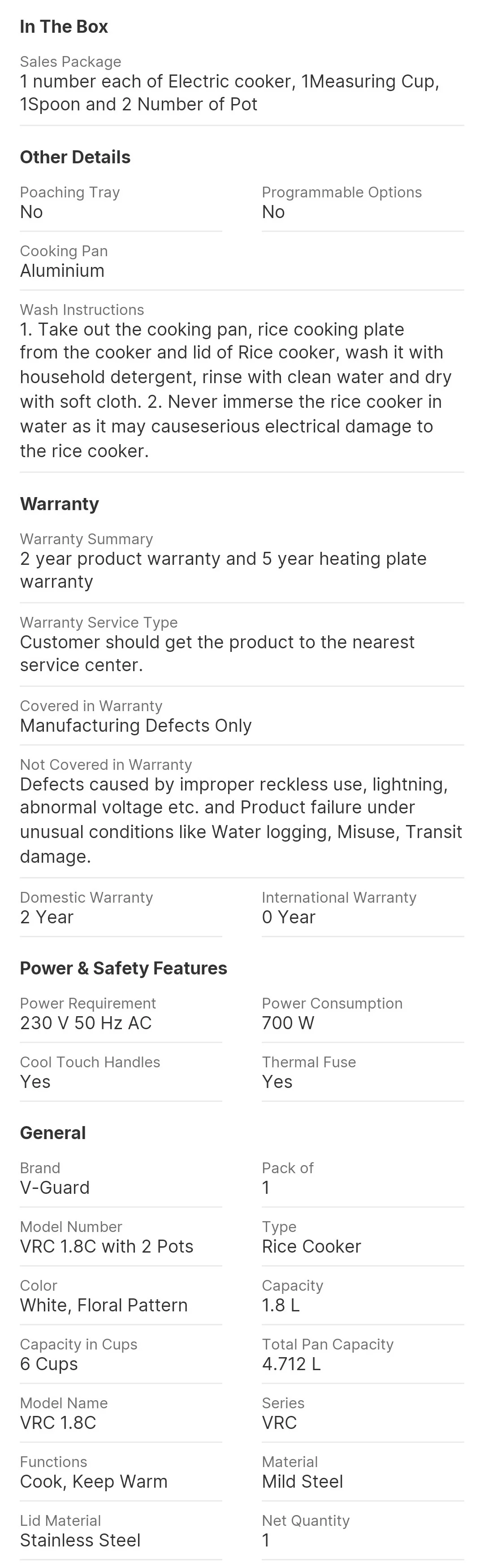 V-Guard VRC 1.8C with 2 Pots Electric Rice Cooker (1.8 L, White, Floral Pattern)