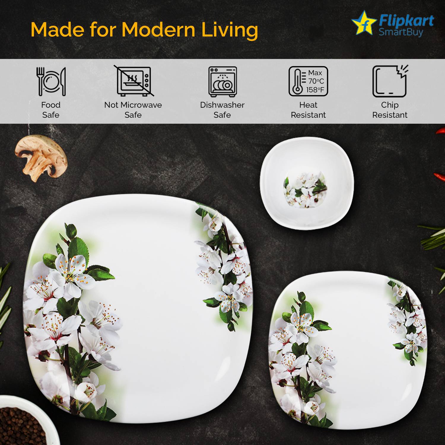 Flipkart SmartBuy Pack of 40 Melamin Emerald Bloom Melamine Dishwasher Safe|Stain Resistant Dinner Set (White, Green)