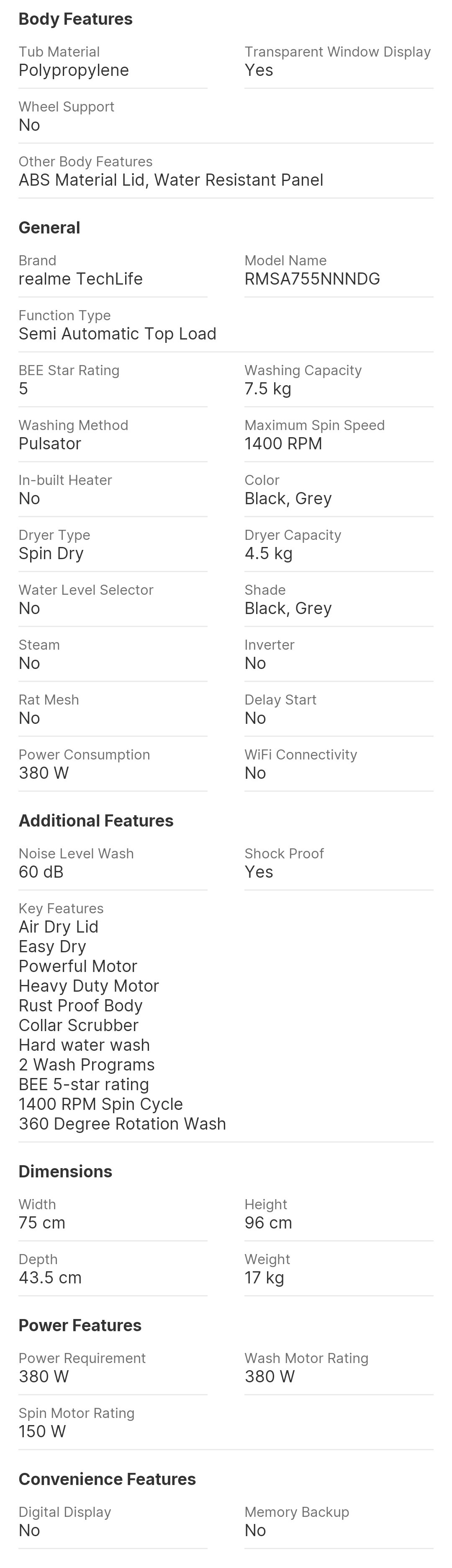 realme TechLife 7.5 kg 5 Star Rating Semi Automatic Top Load Washing Machine Black, Grey (RMSA755NNNDG)